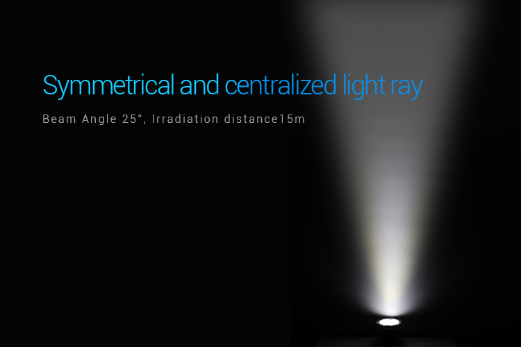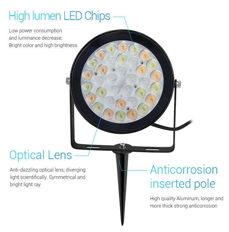 MiLight 25W RGB+CCT Smart LED Garden Light ir dārza prožektors ar IP66 reitingu, 15° gaismas krišanas leņķi, CCT (2700K - 6500K) regulējamu gaismas temperatūru, 2100lm efektivitāti un 2.4GHz WiFi tīkla vadību. Gaismekļa vadībai nepieciešama papildu tālvadības pults, sienas panelis vai arī 2.4GHz Gateway WL-Box1 balss vadībai.