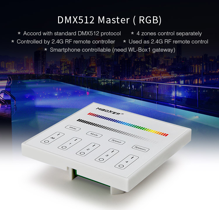 MiLight DMX512 Master (RGB) ir 4 zonu, DMX 512 + 2.4G bezvadu tīkla sienas panelis. Iespējama vadība ar viedierīcēm (papildu nepieciešams MiLight 2.4GHz Gateway WL-Box1)