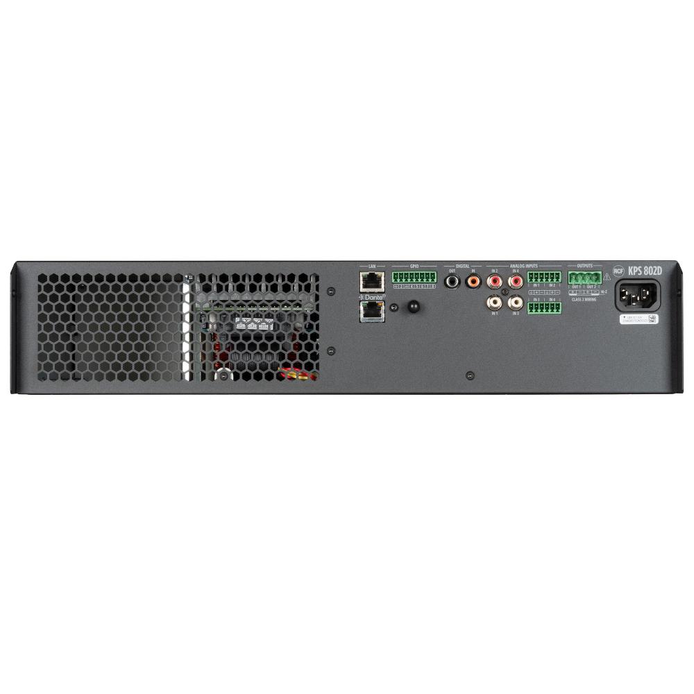 RCF KPS‑802D ir profesionāls 2‑kanālu Class‑D pastiprinātājs ar kopējo jaudu 1600 W, paredzēts prasīgām audio instalācijām, kur svarīga elastība, uzraudzība un precīza skaņas kontrole. Tas apvieno integrētu DSP, tīkla pārvaldību un Audinate Dante™ audio tīkla interfeisu (2 kanāli), padarot to piemērotu modernām audio sistēmām ar daudzzonu arhitektūru.