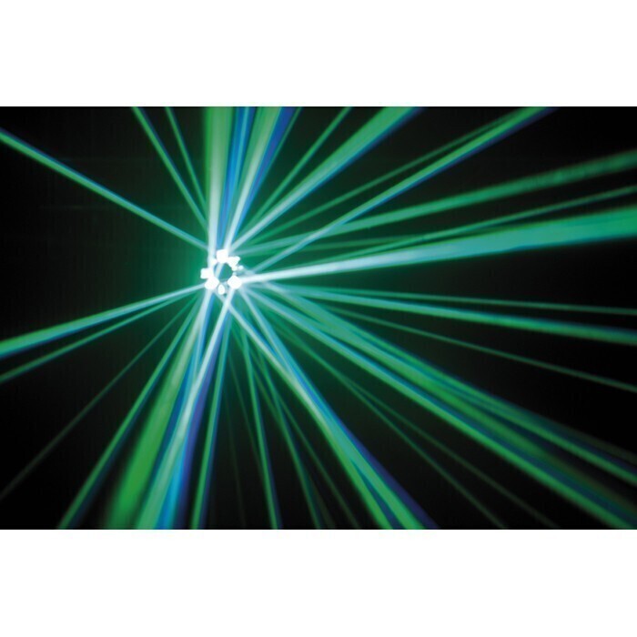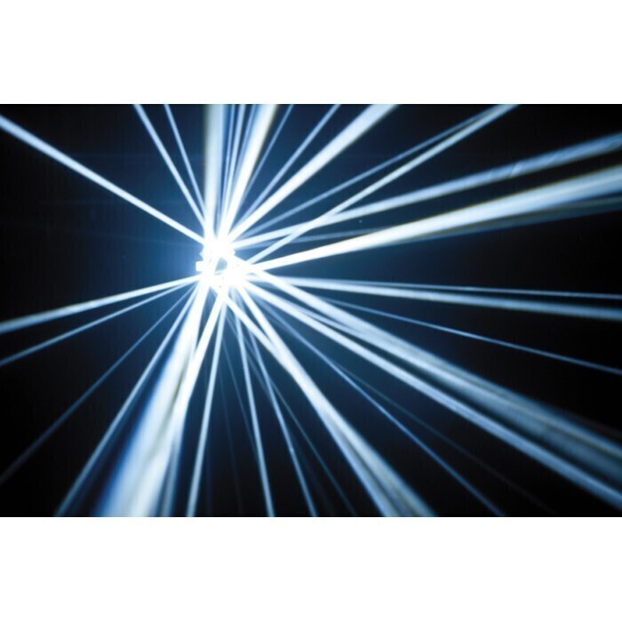 SHOWTEC CYCLONE 4 ir kompakts un dinamisks gaismas efekts ar plašu gaismas pārklājuma lauku. 10W RGBW LED gaismas avots, caur 8 optimizētām lēcām, spēj radīt lāzerasus gaismas starus.