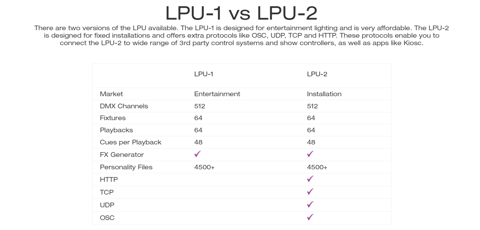 VISUAL PRODUCTIONS Cuety LPU 1 un Cuety LPU 2 ir Cuety aplikācijas DMX-512 kontrolieri, kuri spēj vadīt līdz 64 vienībām.
